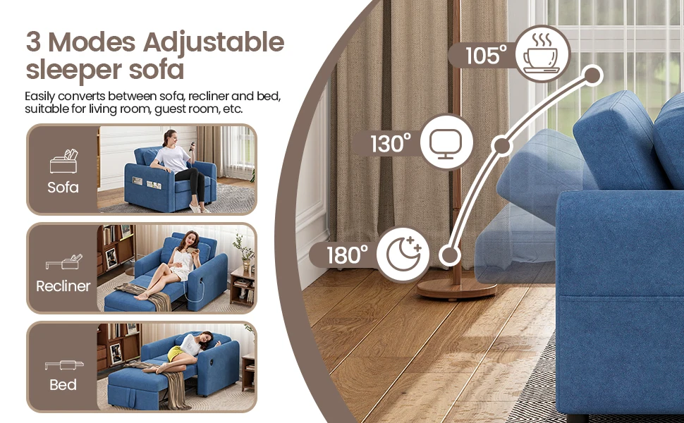 Designed for modern compact living, this 3-in-1 single sofa bed transforms effortlessly from a cozy armchair → a relaxing lounger → a comfortable sleeper. Perfect for small apartments, guest rooms, offices, dorms, or any space that needs style and versatility without taking up much room.