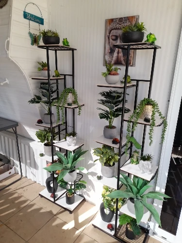 【Sturdy & Durable Structure】The flower rack is crafted from heavy metal frame with black painting, which offers a strong load-bearing capacity, durably prevents from rust and anti-deformation, all the shelves are constructed using MDF board, anti-cracking and fade and crack-resistant, no warping, premium in quality