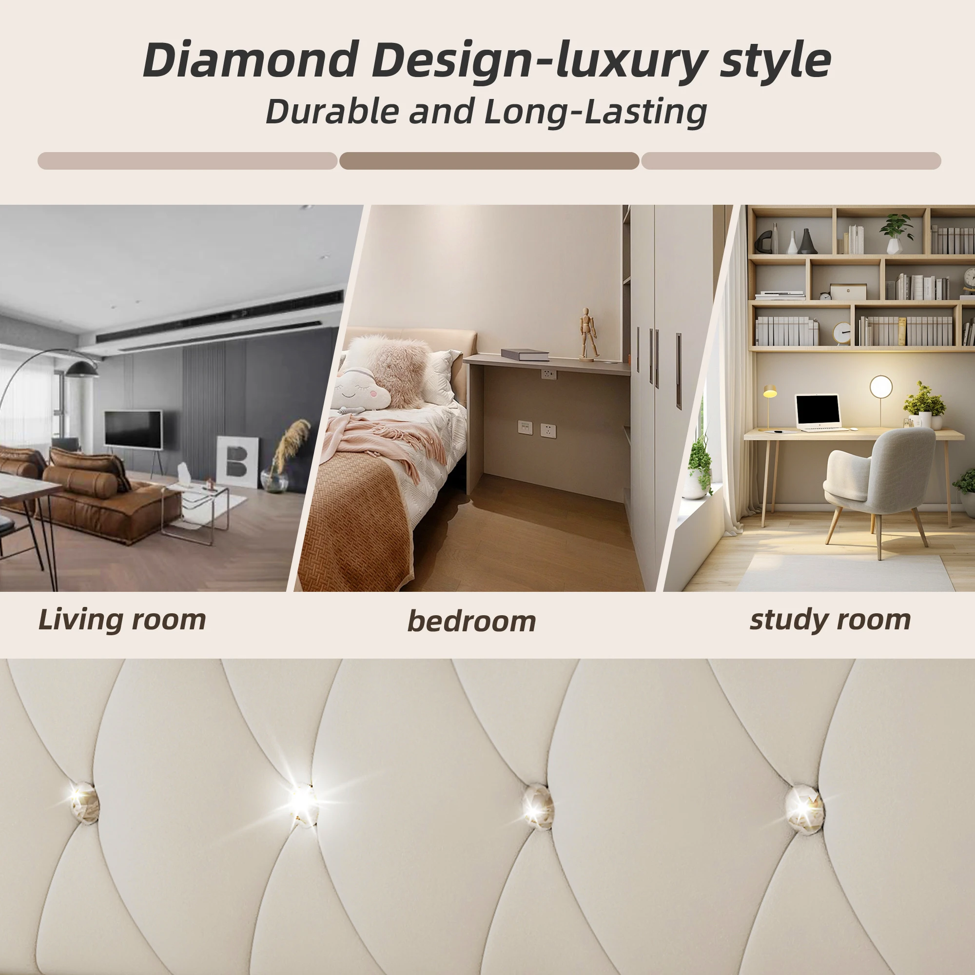 Elegant Appearance & Premium Materials:This upholstered bed is crafted from high-quality velvet fabric, featuring a high backrest design that provides a soft, smooth texture for a cozy and warm sleeping experience. The embedded diamond accents add a refined touch of sophistication, enhancing the elegance of your living space. Available in grey and beige.